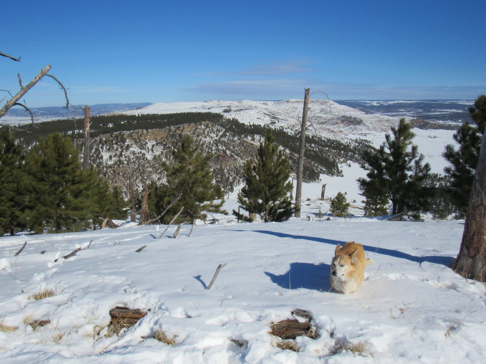 The Carolina Dog was almost down to Bighorn Sheep Pass, when all of a sudden there was an enchanting sound in the forest. Lupe dashed away, snow flying behind her! SPHP followed the Dingo’s shrill yipping to a squirrel tree.